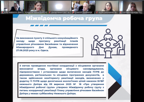 27 листопада 2025 року, в онлайн-форматі відбулося засідання Міжвідомчої робочої групи з питань координації реалізації Плану управління річковим басейном Дніпра у межах суббасейну Нижнього Дніпра.